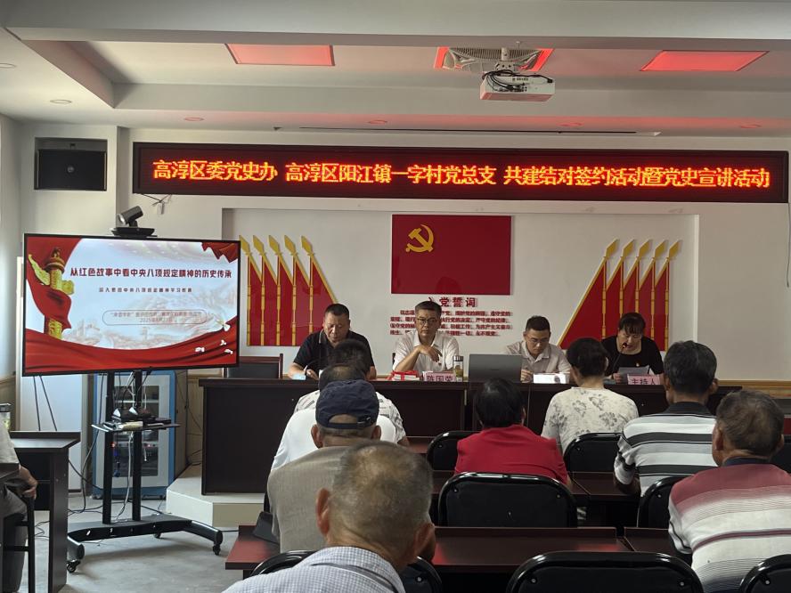 为深入贯彻《党史学习教育工作条例》,推动党史学习教育与基层党建深度融合、同频共振,8月21日,高淳区委党史办与阳江镇一字村党总支举行党建共建签约仪式,通过“结对子、送资源、强宣讲”等举措,将党史学习教育的课堂搬到基层一线,为乡村振兴注入红色动力。高淳区委党史办、阳江镇及一字村相关负责人、一字村党总支全体党员参加活动。