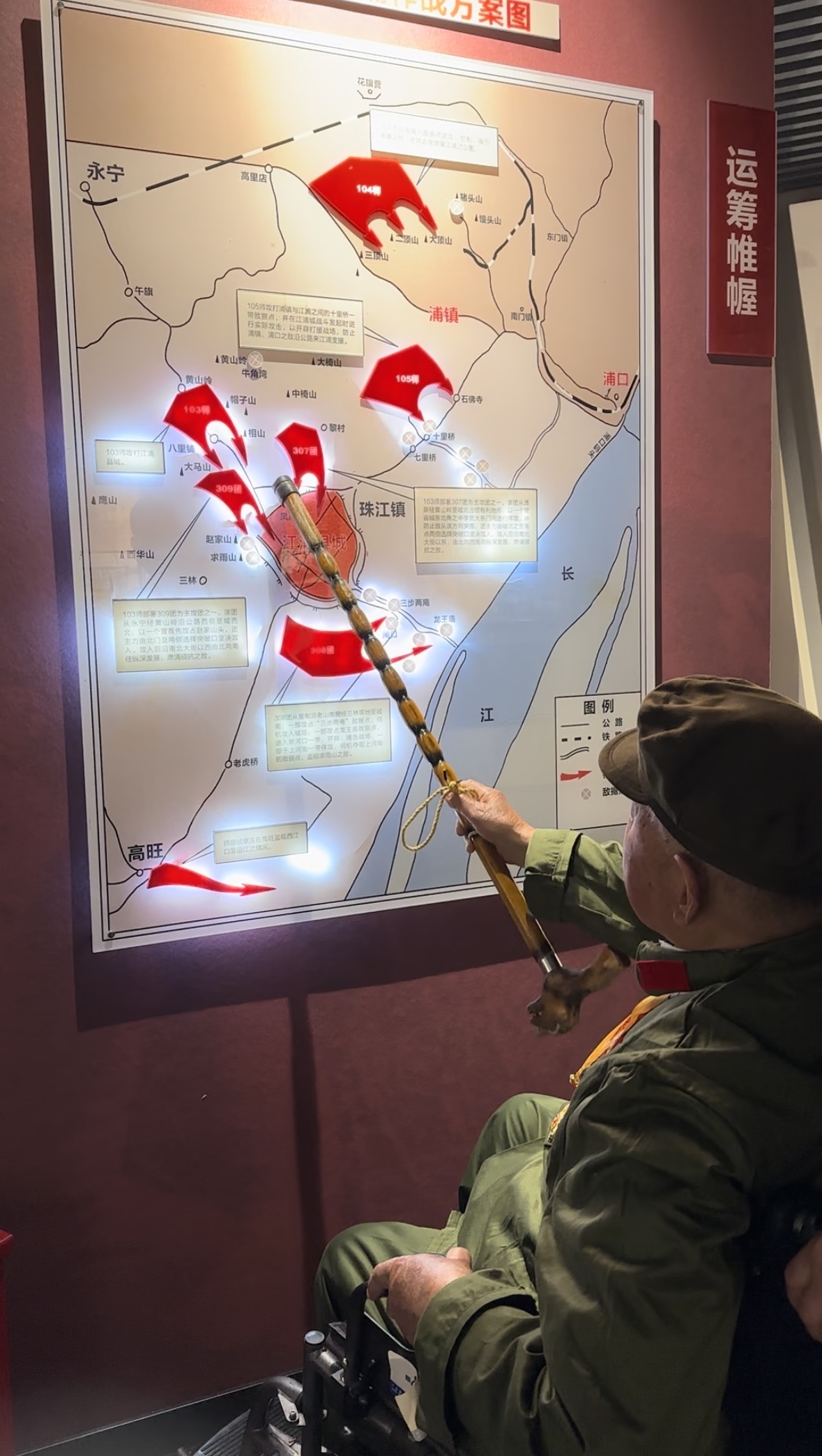 老排长范春振在展厅里看到原35军攻打江浦的作战方案图后,记忆的闸门瞬间打开,现场还原当年的战斗情景。在展陈第四章“胜利足迹