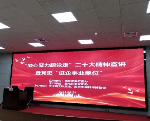 4月24日,一场主题为“凝心聚力跟党走”党史学习教育,在南京中国科举博物馆顺利举行。本次活动由南京市委党史办指导,秦淮区委党史办主办,夫子庙文旅集团、南京中国科举博物馆承办,旨在深入学习宣传贯彻习近平新时代中国特色社会主义思想和党的二十大精神,推动党史学习教育在企事业单位落地生根、开花结果。