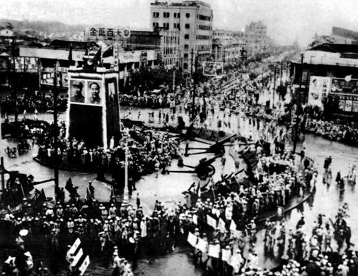 1949102日清晨,在南京新街口广场,南京市各界代表100余人冒雨举行