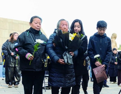 • 夏淑琴老人一家献上鲜花,祭奠88年前遇难的亲人和同胞。 南京日报/紫金山新闻记者 崔晓 孙中元 摄