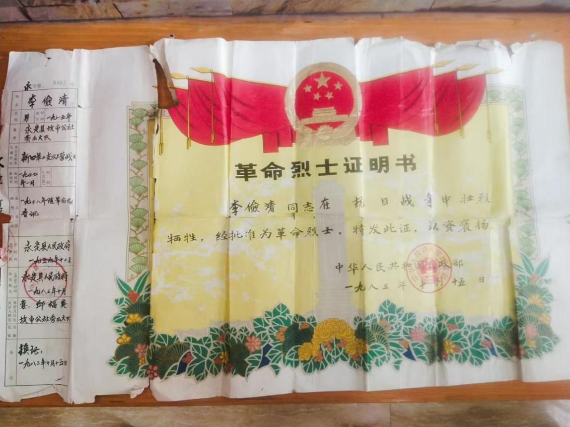 李俭清烈士证明书