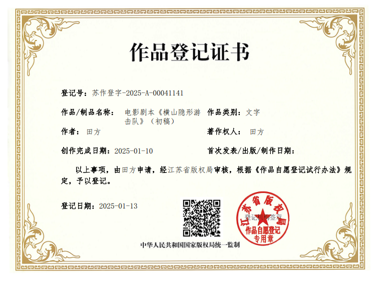 影视导演田方在阅读小说后,结合2025年抗日战争胜利80周年重要节点,主动策划并完成剧本改编。田方从事影视创作二十余年,曾参与《栖霞寺1937》《转业女兵》等百余部影视作品编剧、导演及制片工作。怀着对新四军崇高的敬意,经过与作者土牛深入沟通后,他以小说为蓝本创作了电影剧本《横山隐形游击队》(暂定名),旨在赓续新四军江南抗日历史,弘扬抗战精神,激发新时代爱国主义情怀。