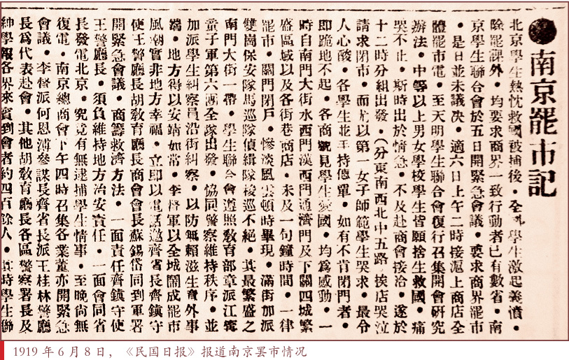 1919年5月4日,北京爆发了要求“外争国权、内惩国贼”、“废除二十一条”、“誓死争回青岛”的反帝爱国运动,并迅速扩展到全国。9日,南京学界举行国耻纪念大会,南京高等师范学校教务主任陶行知等作了激昂悲壮的演讲,表示誓雪国耻的决心,号召南京人民做北京学生的后盾。此后一个月里,南京各界人民不断地举行集会、请愿、游行,抵制日货。到5月底6月初,全市又开展了学生罢课、商人罢市、工人罢工的“三罢”斗争,直到军阀政府被迫免去卖国贼曹汝霖、章宗祥、陆宗舆的职务并拒绝在和约上签字。图为当年的《民国日报》报道南京罢市情况。
