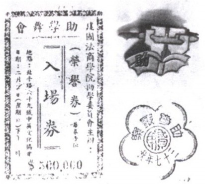 图为助学舞会入场券(左),助学纪念章(右上),助学纪念戳(右下)。