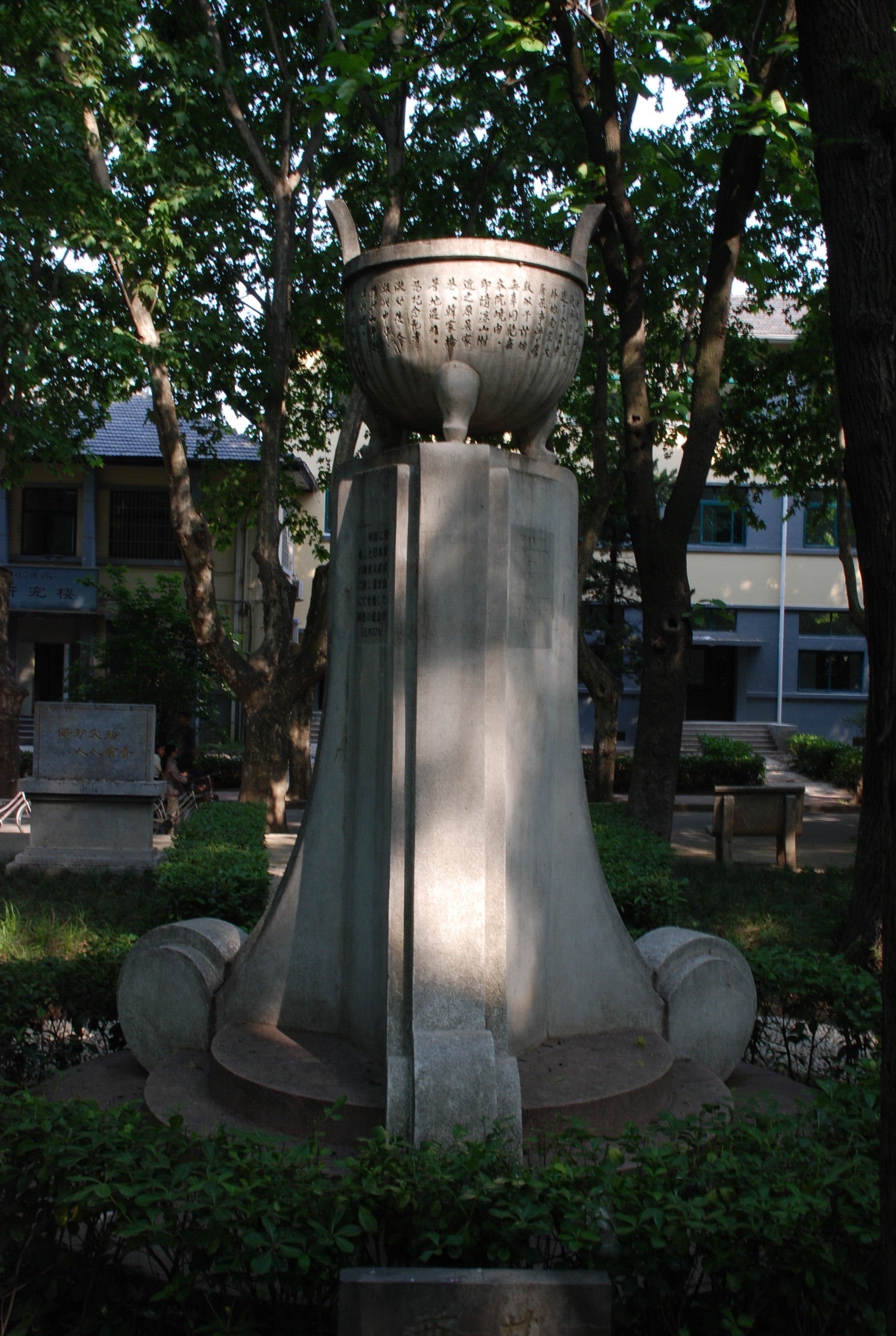 该碑碑形别致,碑的底座为三层红色台阶,碑身是立体白色三个人字形,碑顶上刻置一大古鼎,上刻“居安思危”四个大字。其碑寓意日军屠杀我同胞三十万,血流遍地,并告诫人门生活安乐,不忘历史。其碑文如下:193712月,侵华日军制造了震惊中外的南京大屠杀事件,我数以千计的无辜同胞在本院境内,即清凉山附近之吴家巷、韩家桥等地遇难。为纪念死者,激励后人,振兴中华,维护和平,特立此碑。